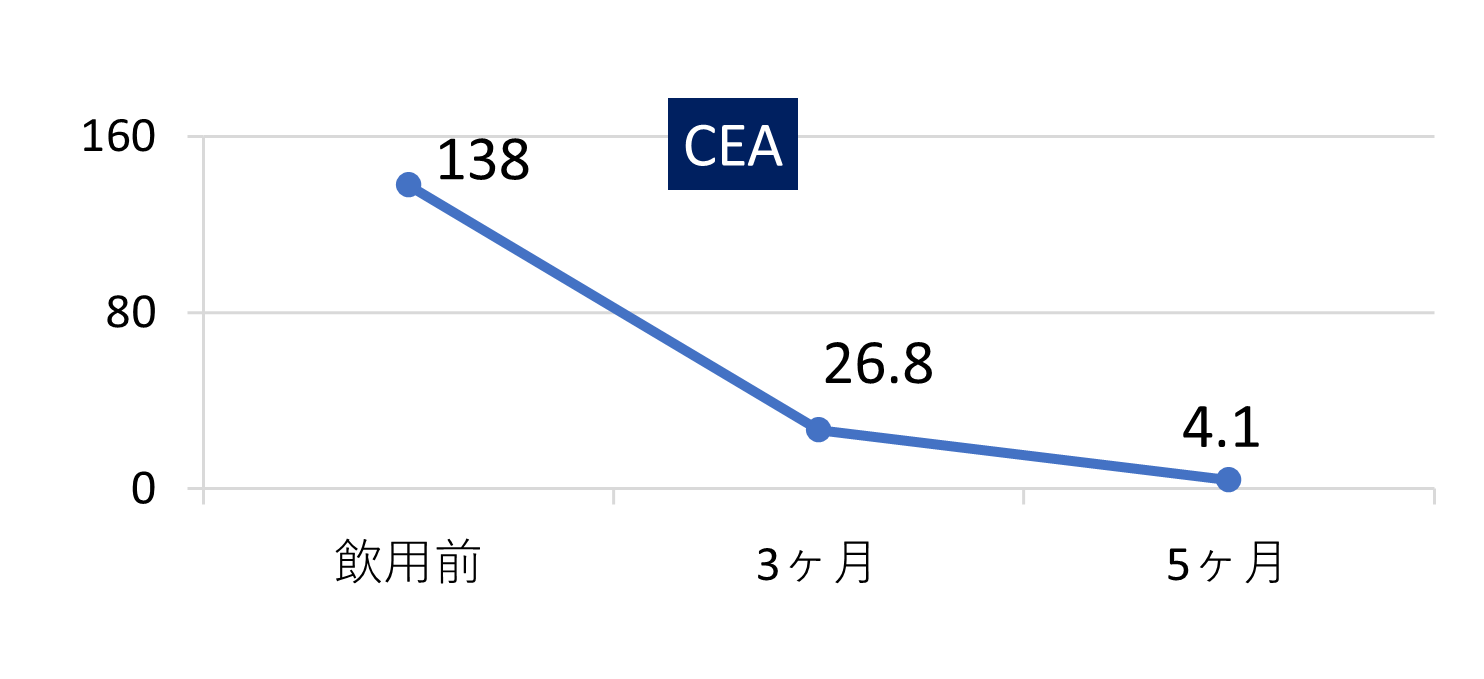 スキルス性胃がんはとても難しいがんだ・・・治療しても効果がないかも知れない・・・腹膜播種は厄介だ・・・など、インターネットで調べれば調べるほど怖くなってきました。その上、食事も満足に食べられない状態が続き、心身共に滅入っていた時に家族が見つけてくれたがんリセット療法®は、私には唯一の望みでした。すぐに始めると決め、当初は腹水の影響で腹部の圧迫感が酷く、カプセルを飲むのも辛いほどでしたが必死で飲み続けました。その甲斐あってか、1ヶ月が経過したころから腹水が減少し、体調が良くなってきました。その後はマーカーも順調に下がり、がんも小さくなってきています。かなり厳しい状態から私を救ってくれたがんリセット療法®には、感謝の気持ちでいっぱいです。まだまだ闘病生活は続きますが、がんを克服するまでがんリセット療法®のお世話になるつもりです。